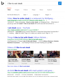 Калі вы шукаеце «Я хацеў бы з'есці біфштэкс», то Bing будзе шукаць сайты, якія маюць гэтую фразу ці нешта падобнае дзесьці ў іх тэксце: