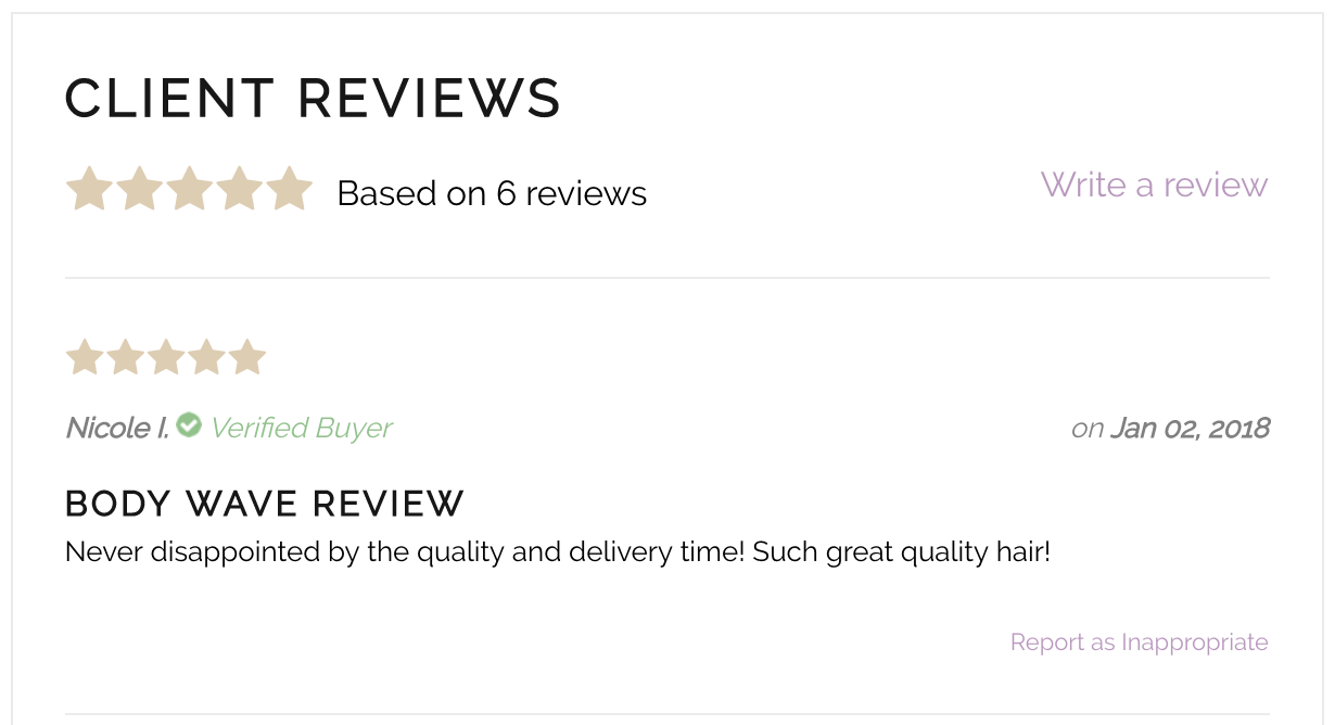 ▢ Подумайте о том, чтобы добавить обзоры продуктов на свои страницы. 95% покупателей прочитайте отзывы, прежде чем делать покупки, что делает их необходимыми для создания доверия. Но обзоры продуктов также предоставляют дополнительный связанный контент на страницы ваших продуктов, которые могут помочь им ранжироваться по длинным ключевым словам. Вы можете установить Отзывы о товаре , бесплатное приложение, разработанное Shopify, чтобы добавить SEO-дружественные оценки на страницах вашего продукта. Я использую его на всех страницах моего продукта.