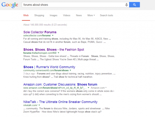 Фраза «форумы об обуви» имеет много результатов, но подумайте, может ли ваша ниша иметь какие-либо горячие темы или под ниши, которые могут иметь свои собственные форумы.