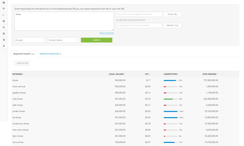 С AffiloTools вы можете начать использовать те идеи, которые вы предложили ранее. Вы можете загрузить результаты в виде файла CSV, включая полезные данные, такие как объемы поиска и стоимость за клик. В этом примере я ввожу «обувь», проверяя, выбрана ли соответствующая страна, и затем нажимаю «поиск», чтобы получить все эти результаты.