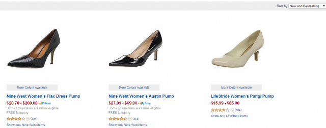 Глядя на обувь на Amazon, если я выберу «Сортировать по: Новые и Лучшие продажи» в верхнем правом углу, я получу список обуви, которые являются лидерами продаж.